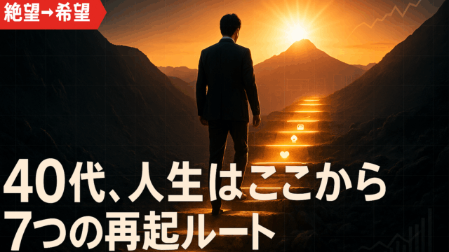 QOL 40代「人生どん底」は逆転のサイン。絶望から這い上がる7つの具体的ステップと再起プラン 鏡に映る、疲れ切った自分の顔。増えない給与明細と、減っていく気力。このまま走り続けても、輝かしいゴールなど見えない…。「俺の(私の)人生、こんなはずじゃなかった」そんな虚しさと焦りが胸に突き刺さり、ただ時間だけが過ぎていく。もしあなたが今、... QOL
