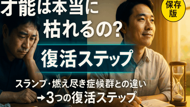QOL 才能は本当に枯れるのか?|スランプ・燃え尽き症候群との違いと復活ステップ かつて、あれほど溢れ出ていたアイデアの泉は、いまや完全に枯れ果てた。目の前の白紙を前に、焦りだけが募り、かつての自分を羨む日々。これは一時的なスランプか、心身が燃え尽きただけなのか、それとも、もう二度と戻らない「才能の枯渇」という残酷な宣告... QOL